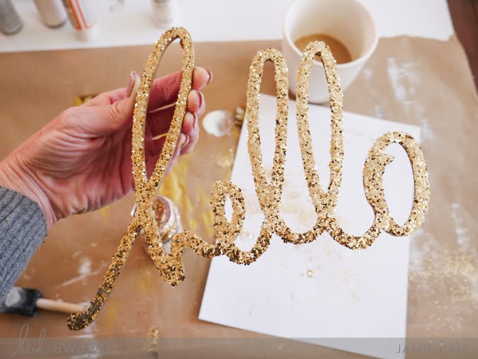 After the Hello was all painted and allowed to dry, it was time for glitter. Glitter is best applied in batches. I would add Mod Podge to a section of the letter, and then add glitter.